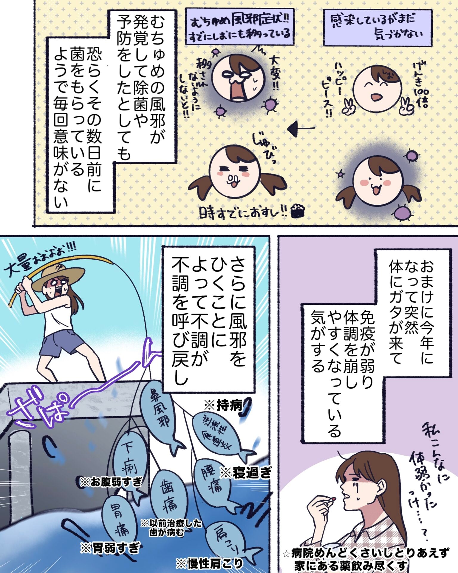 スポンサーリンク おすすめ記事出産よりも産後が辛い。〜新生児編〜1産後はすぐに歯科検診へ!1子よりも風邪が悪化する訳。家族で初めてのクリスマス⑤家族で初めてのクリスマス④ 子よりも風邪が悪化する訳。 2025.12.17 スポンサーリンク 広告 あとがき! むちゅめが風邪を引くと必ず 私に移ってしまう。 風邪症状が出てきた頃にはすでに私に移ってる上 色々対策を練っても時すでにおすしなのだ。 (いや、常日頃から対策やっておけよって感じだよね、わかるー!!) おまけに30代から体にガタがきてしまい 雑魚免疫なのでそれも良くない気がする。 2026年は健康に気をつけたいな…。 17