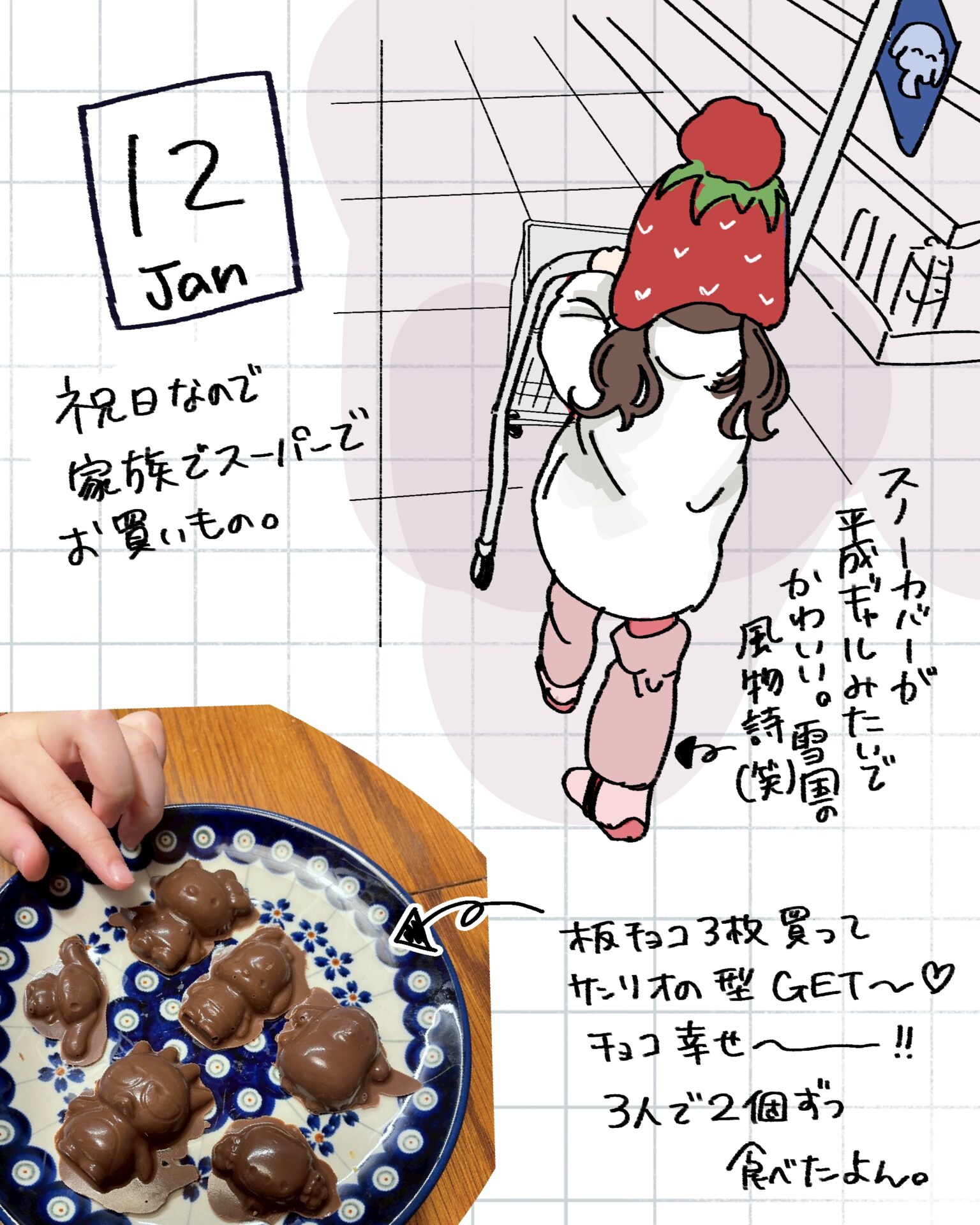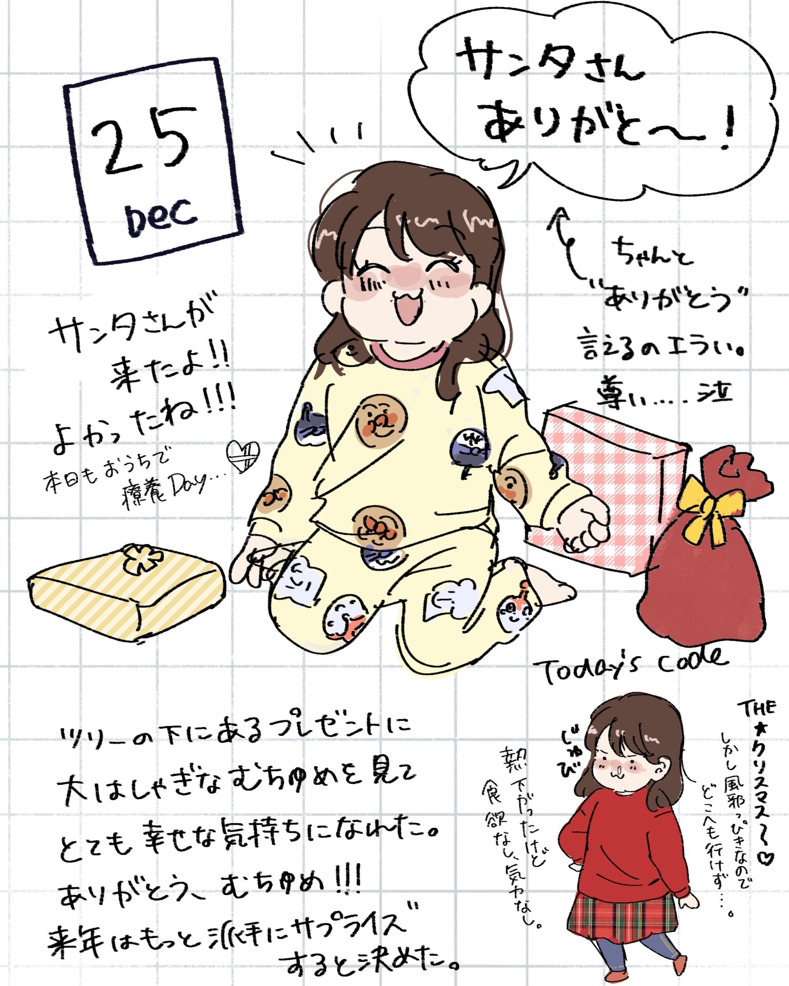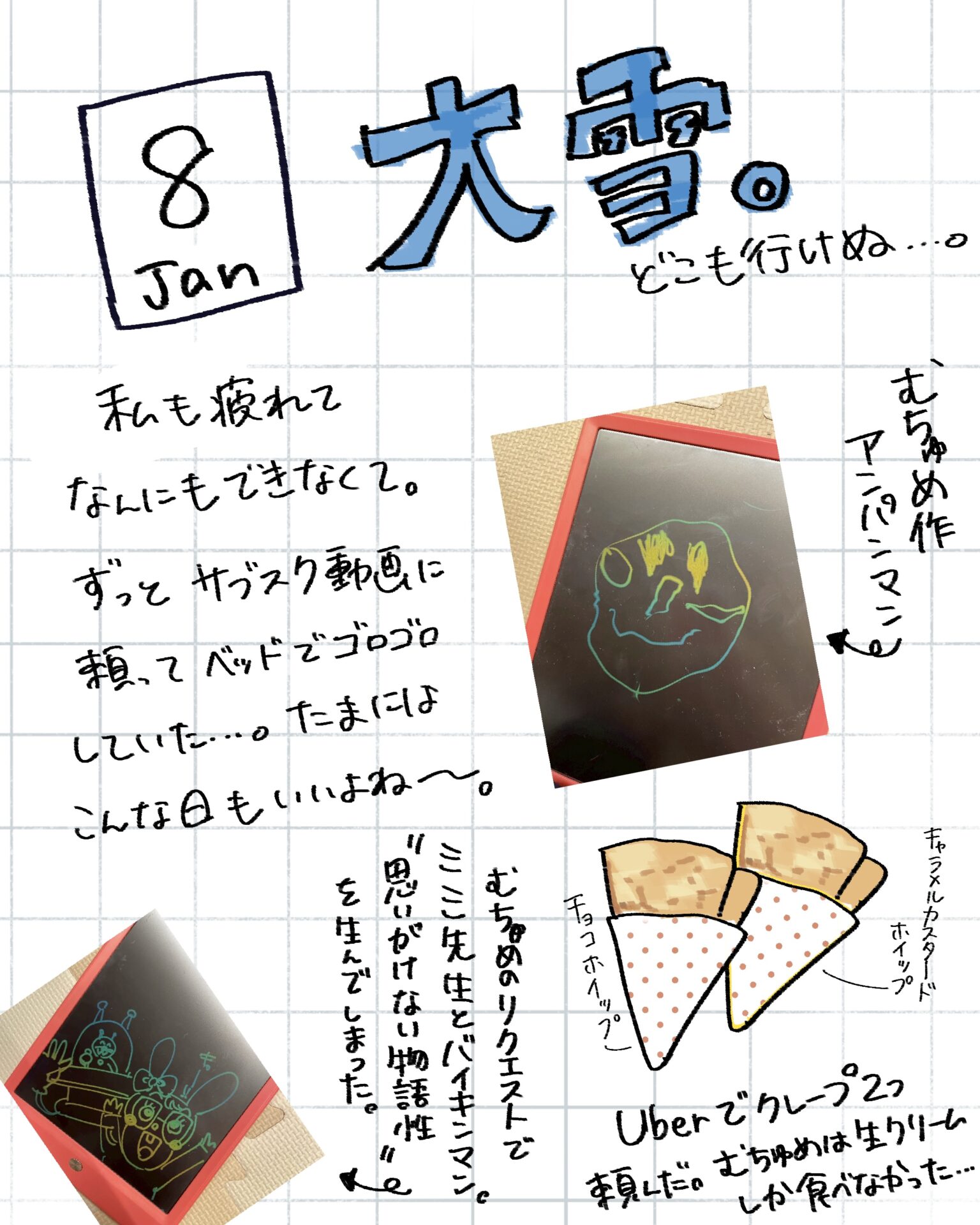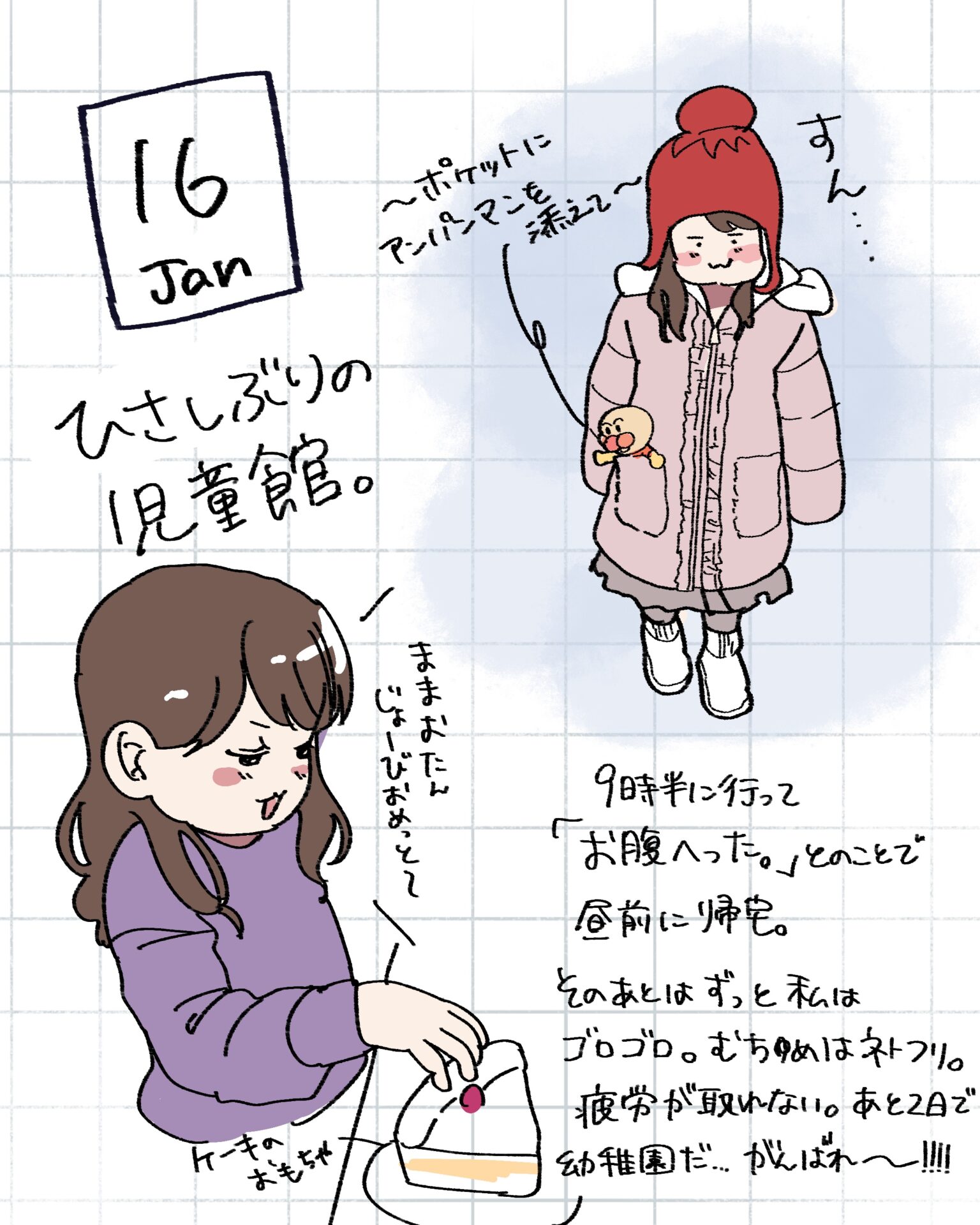 スポンサーリンク おすすめ記事出産よりも産後が辛い。〜新生児編〜1産後はすぐに歯科検診へ!1むちゅめのふゆやすみ。〜絵日記まとめ〜3歳娘とおかいもの。⑤終3歳娘とおかいもの。④ むちゅめのふゆやすみ。〜絵日記まとめ〜 2026.01.20 スポンサーリンク 冬休みに描いた落書き絵日記をまとめたので よかったら見てやってくださ〜い! 間違えて1/1の絵日記を消してしまいました…泣 特に旅行とか遠出はしていないのですが、 近場で遊んだり友人と会ったり 1ヶ月は楽しくてあっという間に終わりました! 毎日は描けなかったけど何気ない日常を できるだけ残せたのでよかったよかった! 広告 広告 広告 広告 2